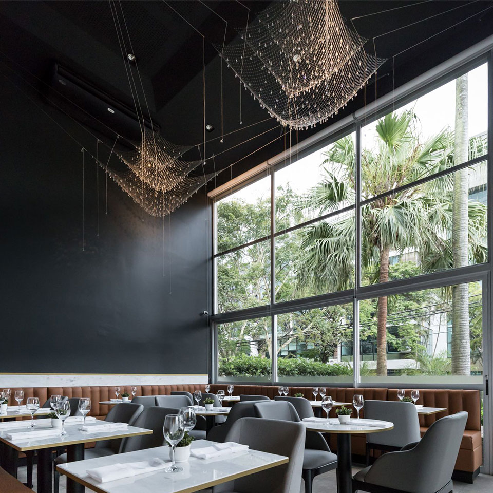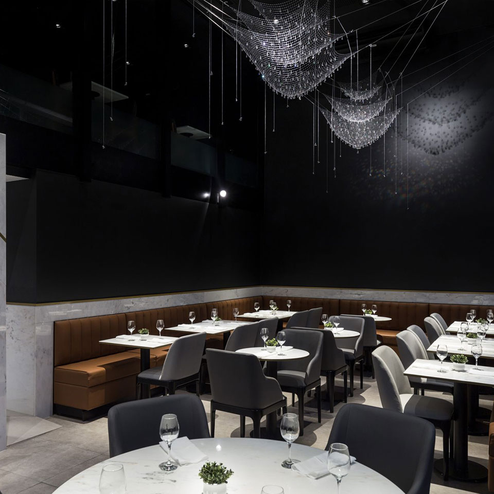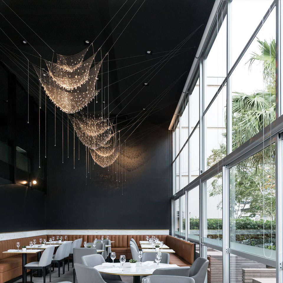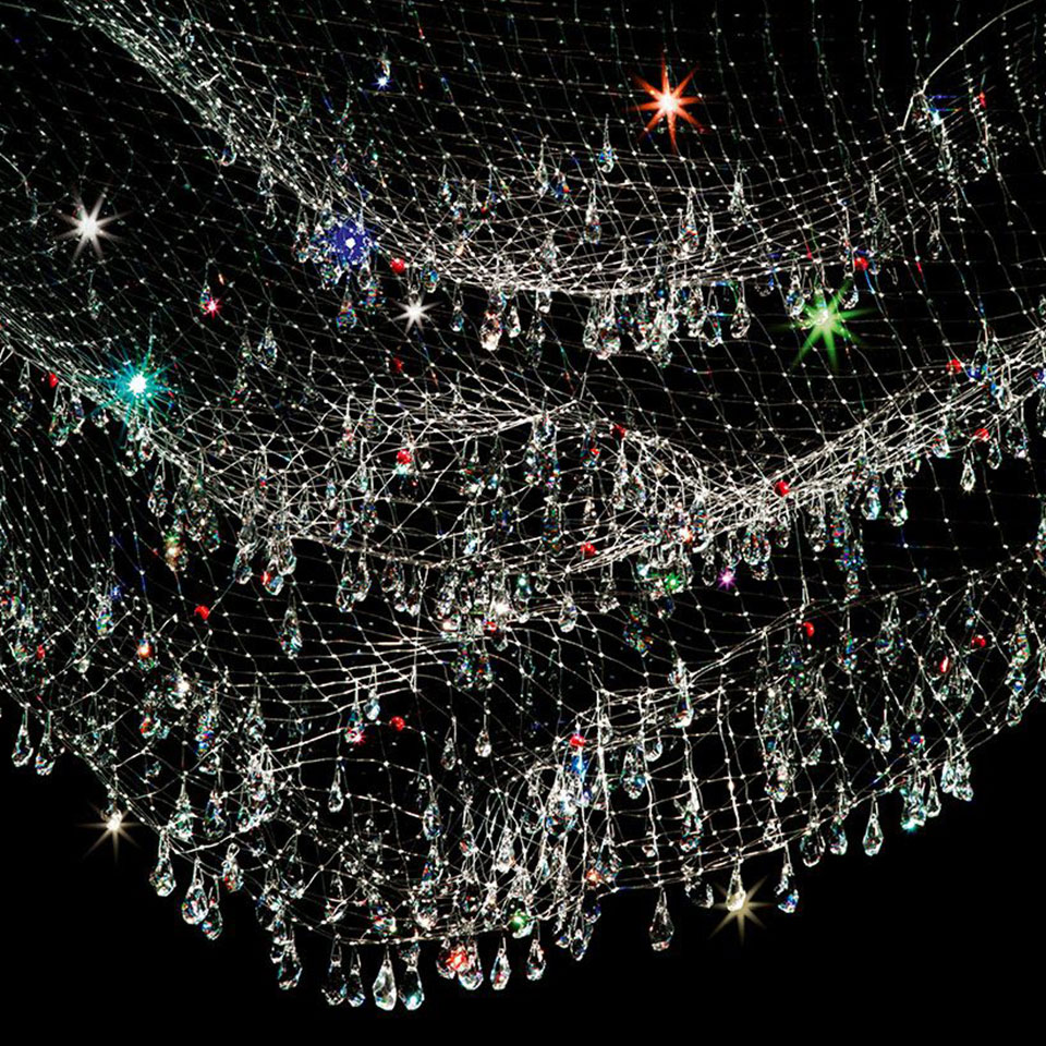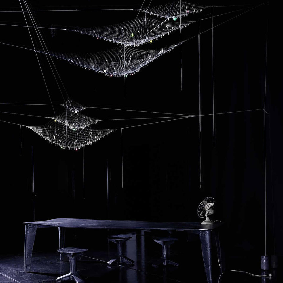 방금 물에서 건져 올린 그물에 물방울들이 햇빛에 반짝이는 모습을 떠오르게 하는 조명